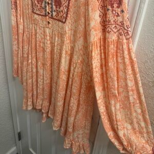 Embrace a bohemian vibe with this peach floral blouse. Perfect for casual outings, it features intricate patterns and a relaxed fit.