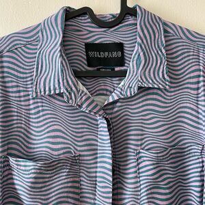 Fun, discontinued wavy print in light purple and blue. Pearlescent blue buttons. Only worn a handful of times, from a smoke-free home.