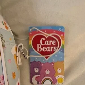 Charming Loungefly bag with Care Bears design. Light blue base with colorful characters. Ideal for kids' playful style.