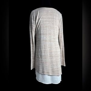 Elegant V-neck sweater with layered design. Soft beige knit with white accents. Ideal for versatile styling.