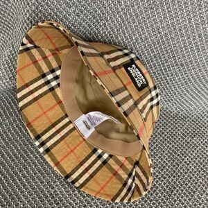 Classic Burberry bucket hat with signature check pattern. Features a bold logo patch.