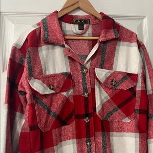 Stylish plaid shirt with button-up front. Features dual chest pockets.