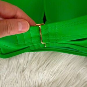 Beautiful jewel green with gold clasps. Halter tie neck and strappy side details. Back closes with double gold hook and eye, 3 different slots for an adjustable fit. Underwire, heavy padding and push up padding. No flaws.