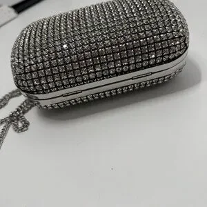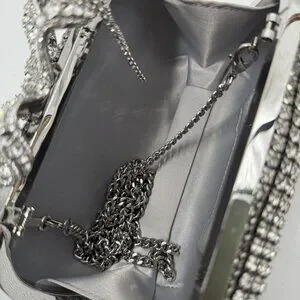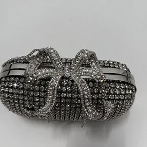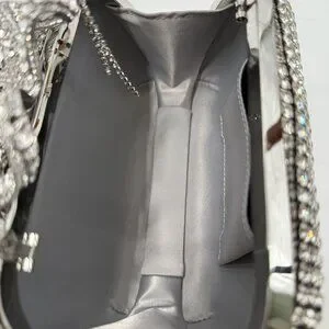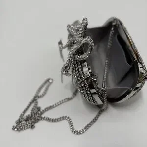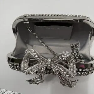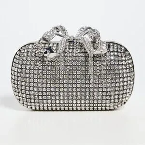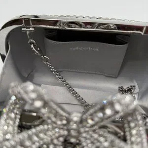 Sold out online, the silver Self-Portrait clutch showcases elegance with its crystal embellishments and a striking bow detail. Its sophisticated design is ideal for formal events and special occasions, ensuring you stand out in any setting. An interior chain strap offers versatility, allowing you to carry it as a shoulder bag or clutch.