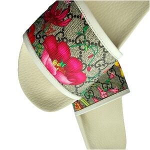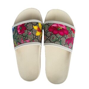 I ship next day!! Authentic Gucci slide sandals featuring the iconic GG monogram with vibrant floral "Blooms" print. Neutral beige footbed with embroidered floral strap. Easy slip-on style—perfect for summer, resort, or casual luxury looks.