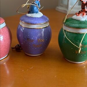 Charming Disney bell ornaments from Bradford Exchange featuring Winnie the Pooh and friends. Perfect for holiday decor. Includes purple, green, and red designs. Never used