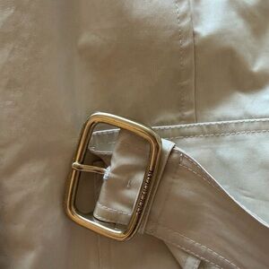 Classic Burberry trench coat in light tan. Has stain in back (see pictures).
