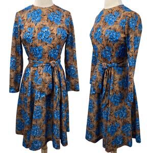 Vintage 60s Floral Fit & Flare Dress Tie Belt Long Sleeve Brown Blue Womens 8