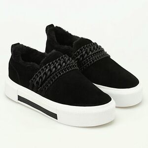 Suede slip on sneakers detailed with tonal chain detail on front, faux fur inner and contrasting rubber sole.