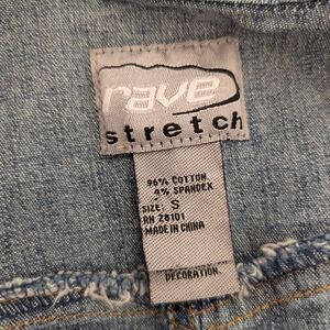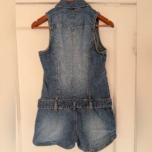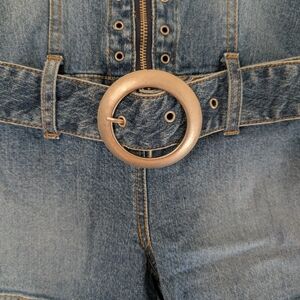 Vintage Rave denim sleeveless romper featuring a zip-up front and matching belt. Perfect for clubbing or a rave.