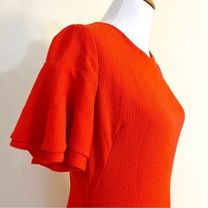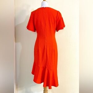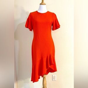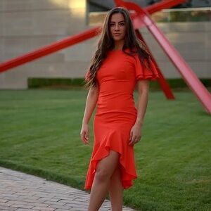 This striking orange dress by Black Halo features an asymmetrical high-low hemline with dramatic ruffles, perfect for a wedding guest or cocktail event.