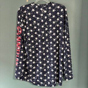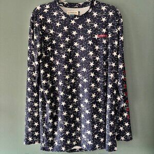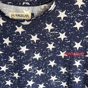 The Magellan Outdoors Shirt Fish Gear Tunic in size L is a patriotic holiday-themed top suitable for various occasions such as travel, activewear, casual outings, and workwear. This blue, white, and red shirt features a stars pattern, crew neck, long sleeves, and offers UV protection, cooling, moisture-wicking, and breathable properties. Made for women who enjoy outdoor activities, this shirt is designed for comfort and style with a hint of Americana flair. Perfect for fishing enthusiasts or anyone looking for a bold statement piece for their wardrobe. Fish, Holiday, Outdoor, Patriotic, USA, Bold Statement, Cooling Casual