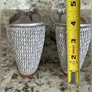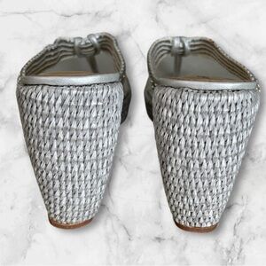 • Material: Features a unique woven raffia-style midsole with a metallic finish and a smooth leather footbed.