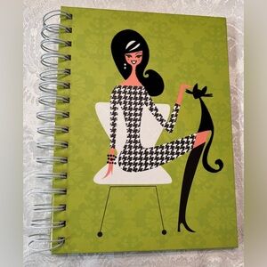 Chic journal notebook featuring a fashionable illustration of a lady and her cat in black and white on a green cover. Perfect for cat lovers! Cat and lady’s hair in raised felt on the hardcover front. Spiral bound, lay flat pages.