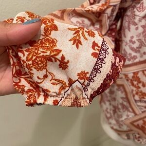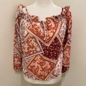 Forever 21 women’s peasant-style blouse with a bohemian patchwork floral print in earthy tones of rust, cream, and burgundy. Features long sleeves with elastic cuffs, a tie-front neckline with ruffle trim, and optional off-shoulder styling with adjustable spaghetti straps. Lightweight and flowy, perfect for a casual chic look.