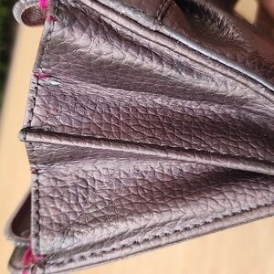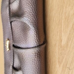 Juicy Couture Iridescent Convertible Purse Wallet. Gold tone hardware. Missing strap. Multiple pockets & slots. 8” x 4” x 1”. Slight wear on the corners and sides and missing the zipper pull on the back exterior pocket.