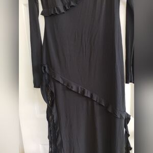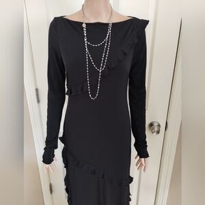 This chic black dress features elegant ruffle accents and long sleeves, perfect for any occasion. Its timeless design offers both style and comfort.