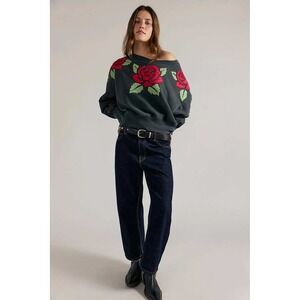 Free People Pullover Womens Size L Dark Grey Red Roses Good Vibes NWT