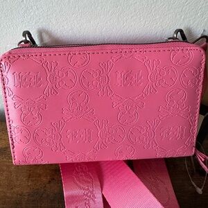 Ed Hardy Vibrant Pink Skull Embossed Crossbody Bag Wallet with Wristlet NWT