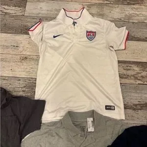 Collection of polo shirts in various colors including white, gray, navy, and yellow. Perfect for casual wear. 3 still have tags on them