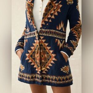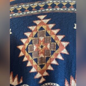 Cozy cardigan with intricate knit design. Features a blend of deep blue, rust, and tan hues.