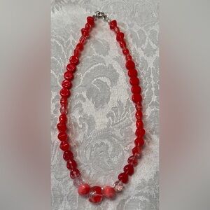 Red beaded necklace in Czech glass beads with spring clasp closure. Add a pop of color to your outfit with this stunning piece. Measures 16”.
