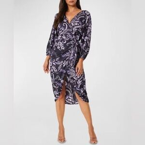 Misa Los Angeles Sylvia Indigo Vines Floral Purple Faux-Wrap Midi Dress EUC Sz S