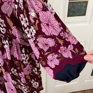 Step out in style with this chic floral long sleeve dress. Featuring a stunning blend of burgundy and pink, this dress is perfect for any occasion. Embrace elegance and comfort with every wear; pit to pit 19 inches; shoulder to shoulder 15 inches; arm length 22 inches; length of dress 34 inches; no size tags, but going by measurements and flowy design, would probably fit a medium to large