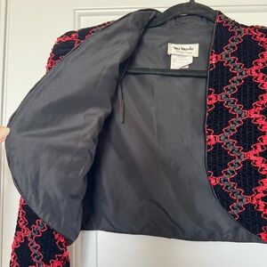 Elevate your style with this vintage cropped jacket. Featuring a striking black and red pattern, this piece adds a bold touch to any outfit.