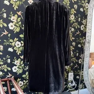 Chic brown velvet duster with brown lining. Elegant and stylish design. Two front pockets. Hook and eye closure. 37 inches long from shoulder.