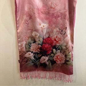 MAKO 100% Silk Lines Floral Butterfly Scarf with Fringe. Gorgeous calla lilies and other flowers and butterflies. Soft, elegant and cozy. Statement piece. Art to wear.
