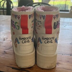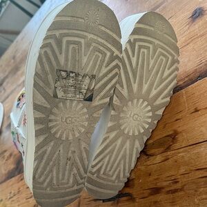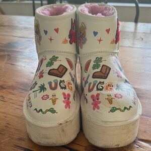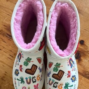 Vibrant UGG ankle boots with playful graphics. Cozy and stylish design.