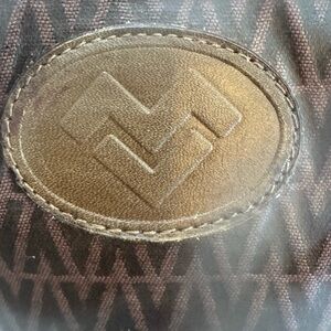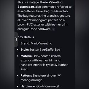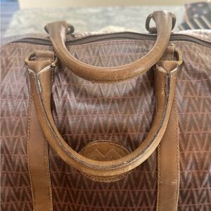 Elegant vintage Valentino brown duffel with pvc coated exterior, leather handles and details and antique brass hardware. Signature v-pattern. Ideal for travel/carry on