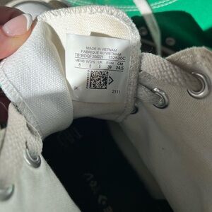Classic Converse high-tops in white with green accents. Timeless style and comfort. These were worn for only about a month so much life left! Willing to negotiate!!