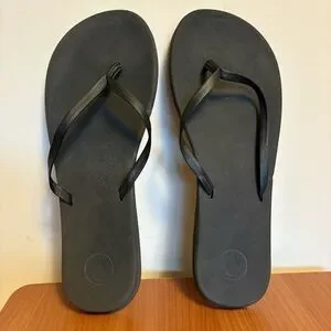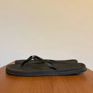 These classic black thong sandals from Volcom are made of synthetic leather Prayer Thong Upper, they have BLOOM Foam Molded Footbed, Built-in Arch Support, Rubber Outsole Tread. Black sturdy minimalist flip flop sandals.