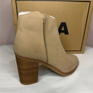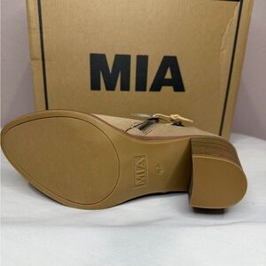 Stylish MIA ankle booties in beige. Features a chunky heel and side zipper. New in box!