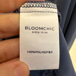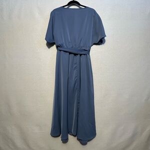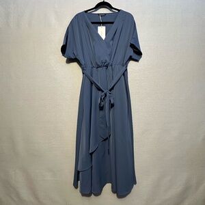 NWT Bloomchic Midi Dress in a grey-ish blue. Surplice v-neck. Short dolman sleeves. Elastic at waist. Pockets. Belt/tie at waist. Unlined. Size 12.