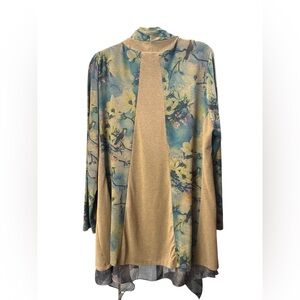 This open-front cardigan features a lightweight fabric with a stunning nature-inspired print of florals and birds in earthy tones of teal, tan, muted gold, and soft neutrals. The draped, waterfall-style front and asymmetrical hem create gorgeous movement and a flattering, elongating silhouette.