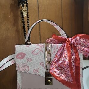Stylish and chic, this Aldo handbag features a pink patterned design with a striking red bow. Perfect for adding a pop of color to any outfit.