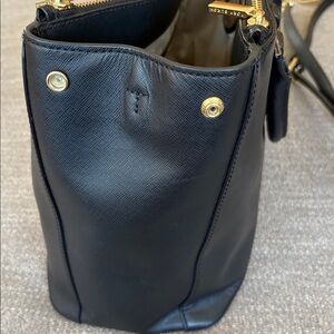 Chic black leather handbag with gold accents. Features signature logo lining. There’s a few minor issues: small cut in the leather near one strap (not really noticeable unless you look closely) and the main compartment liner has some stains (see photos for details). Measures approximately 15 inches across the purse by 9 inches high and 7 inches when fully open. Please let me know if you have any questions!