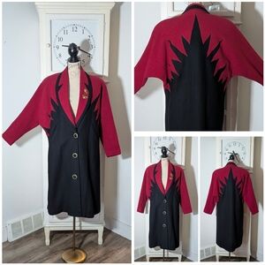 Equal parts avant-garde and wearable, this is for someone who understands that a great coat is the outfit. 100% wool outer lined in satin material. Beautifully preserved vintage. Ornate button front. Two slanted functioning side pockets. The gold ornate emblem is not a brooch but instead an intentional part of the coat.