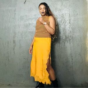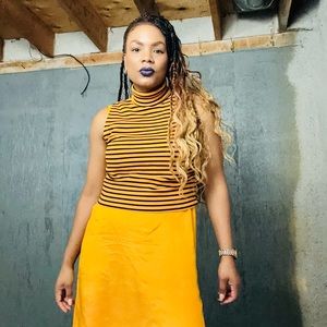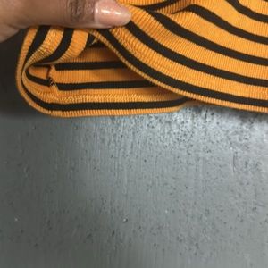 Stylish turtleneck sweater. Black and orange stripes. Perfect for layering.