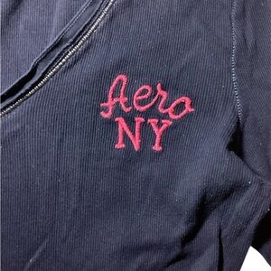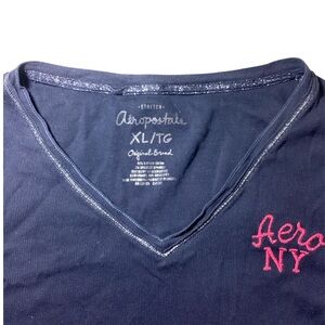 Dark blue V-neck top featuring a pink 'Aero NY' logo. Long sleeves for a classic look. All signs of wear shown in pictures. Size M