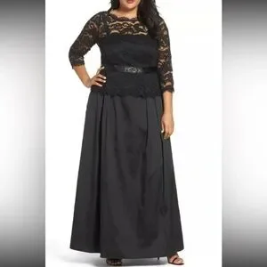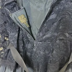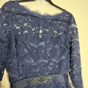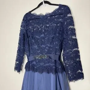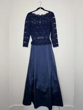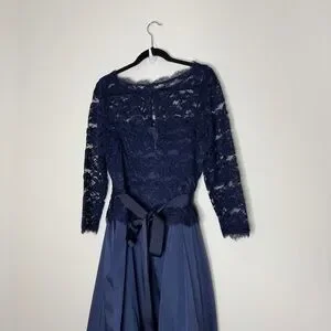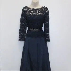 Navy lace bodice with sheer long sleeves. Fitted waist with subtle beaded detail. Flowing navy skirt for graceful movement. Classic, refined evening silhouette. Great condition. Dry cleaned