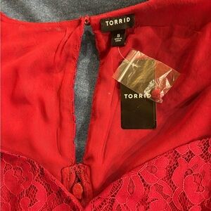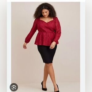 New with tags long sleeved top from Torrid in size 5. Zipper in the back. Sweetheart neckline. Peplum style. Red wine color