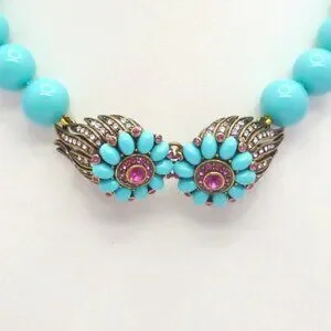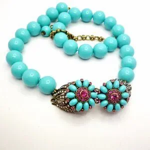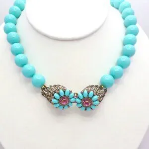 This beautiful necklace from Heidi Daus features turquoise colored, hand knotted Lucite beads and a double "pendant" with fuchsia/purple and clear Swarovski crystals. Please note that it is best worn as a choker/collar necklace so the pendant area hangs correctly. Everything is in perfect condition. I acquired this and many other pieces of Heidi Daus from the estate of a serious collector, check out my other items!