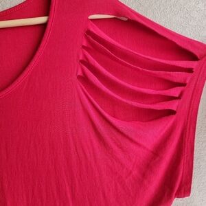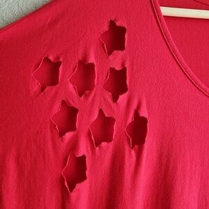 Red short sleeve top with cutout stars on right sleeve and cutout "stripes" on the left. Perfect for Fourth of July, 9/11, Veterans Day or just loving the USA and being proud to be an American! 🇺🇸