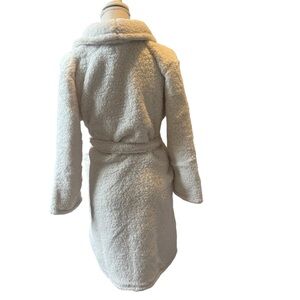 Made from cozy polyester fleece, this robe features long sleeves, a collared neckline, and a tied closure for a comfortable fit.
