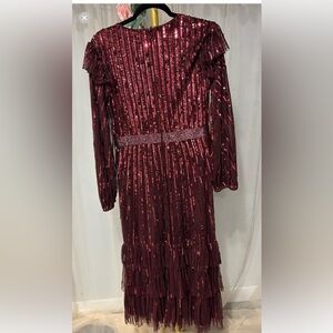 Elegant burgundy sequin dress. Features long sleeves and ruffle details. Perfect for special occasions.