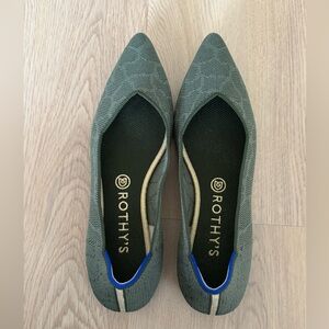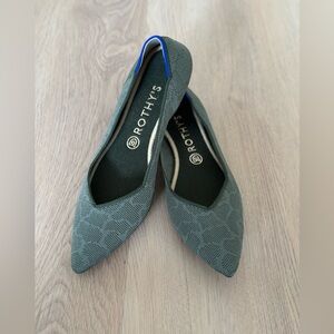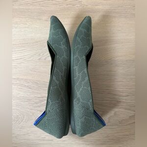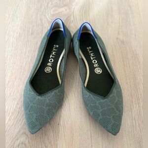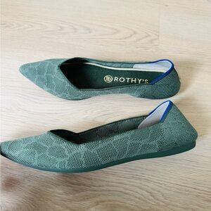 Retired color! Olive green pointed flats with a tone-on-tone giraffe pattern. Comfortable and eco-friendly design, machine washable.